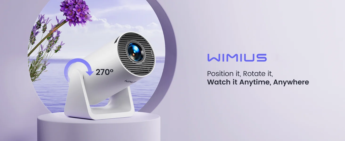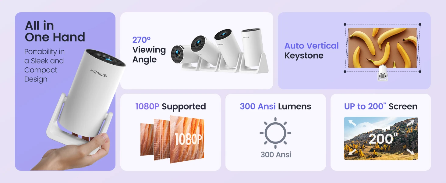 ?270° Built-in Stand & All in One Hand?This mini wimius projector has 9500 lumens, a brightness of 300 ANSI, a maximum supported resolution of 1920* 1080p and a contrast ratio of 10000:1.More stable triangular stand, allowing you to effortlessly adjust the angle for the perfect viewing experience. With a net weight of just 1.32 lb, small but not simple, instantly project your movie further onto the ceiling. Take it anywhere, and savor high-quality visuals, whether you're indoors or enjoying an outdoor movie night.