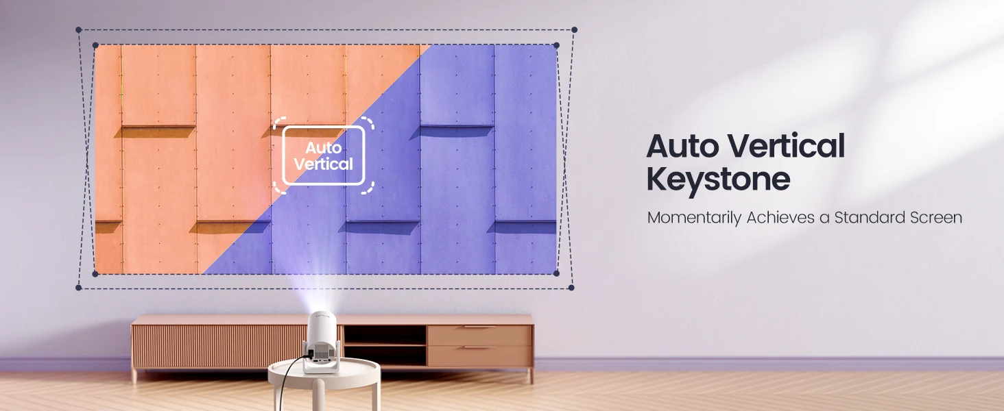 ?Auto Keystone Correction & 1080P Supported?Say farewell to distorted images with our auto vertical keystone correction, enjoying your home theater without alignment concerns.The mobile projector supports automatic trapezoid up and down ° 30, simply adjust the body vertically and the screen will automatically adjust to a rectangular shape.With 1080P supported resolution and remarkable 10000:1 high dynamic contrast ratio, it faithfully reproduces real color content. Additionally, benefit from convenient features like Online Update(OTA), Auto Sleep mode, and Brightness & Color Temperature Adjustment.