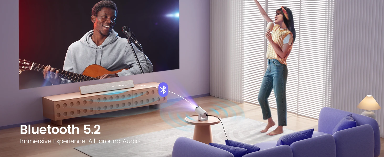 ?2.4G/5G Dual Band WiFi & Bluetooth 5.2?Dual assurance with both 5G and 2.4G speedy WiFi options, along with dependable wired connections. In addition to wireless screen mirroring through Miracast and Airplay, Projector supports wired screen mirroring, enabling seamless YouTube streaming under a wired connection. Connect Bluetooth headphones, speakers, or AirPods more stably with Bluetooth 5.2.